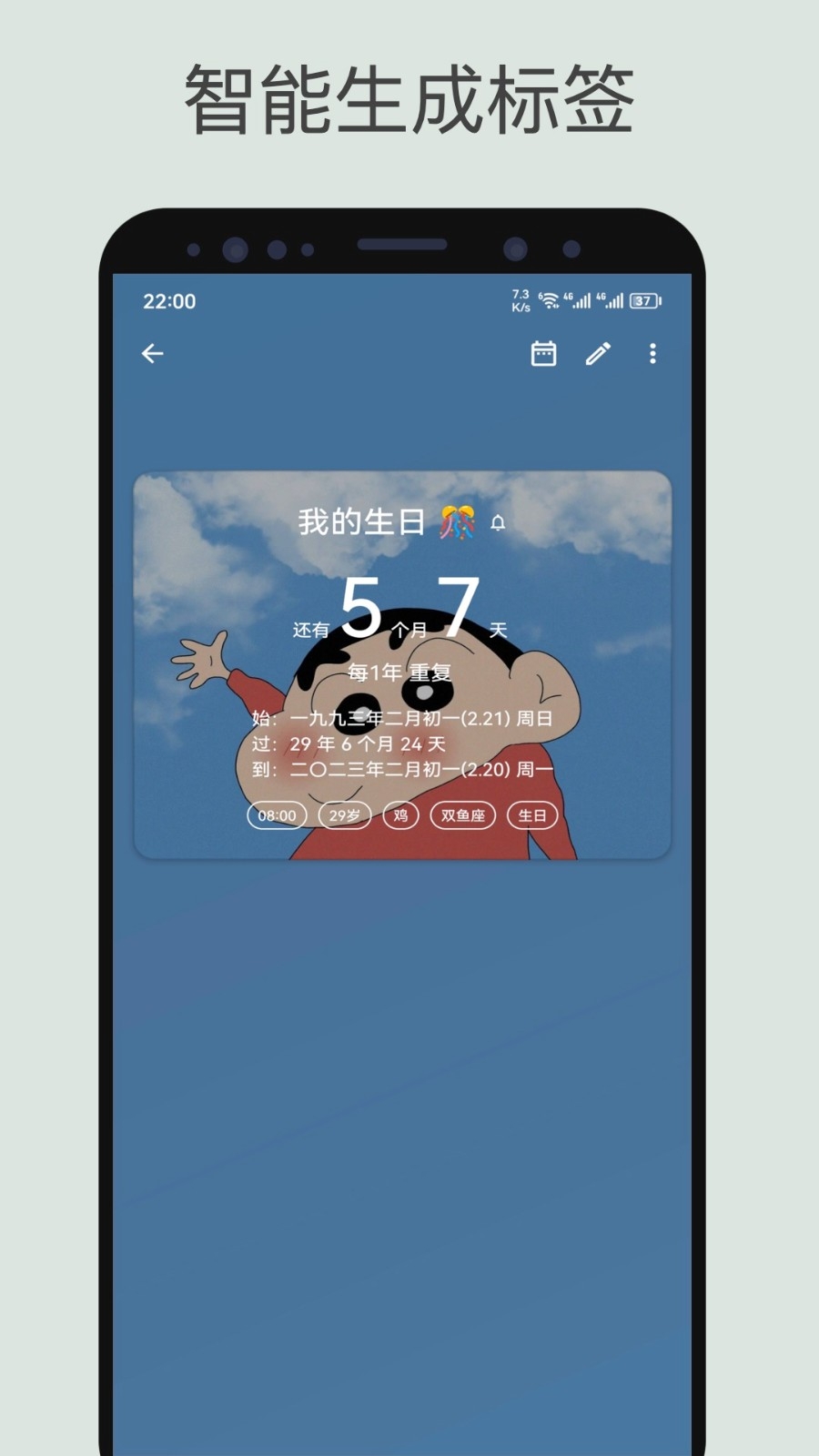 各种正数日、倒数日、纪念日、交房租、生日、交水电费等活动,都可进行添加设置提醒;
