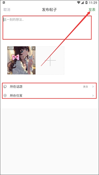 3、编辑您要分享的内容,然后选择话题分类和位置信息,最后点击右上角的“发表”即可。