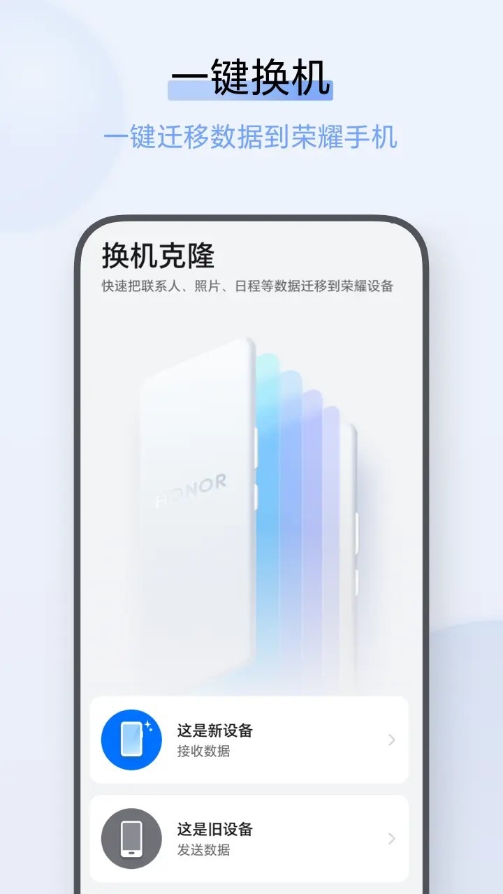 荣耀换机克隆是一款对于手机进行数据转移的软件。该软件上面的功能也是非常的强大,该软件上可以实现对于资料和数据的转移,而且该操作不需要进行联网,对于手机上的软件或者是通讯录所以的内容都可以进行转移,非常的实用,对于有需要的用户们可以进行下载。