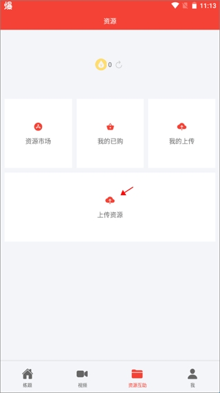 1、注册账号并登录公共基础知识真题软件主页面,点击下方菜单栏【资源互动】模块,点击上方的“上传资源”。