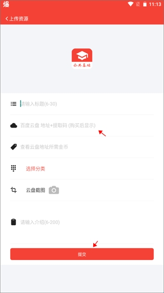 2、取一个跟你资源相匹配的名称,百度云盘的下载链接和提取码,输入购买的金币数量,再输入一些文字介绍之后就可以点击提交了,上传成功就能够在“我的上传”里查看上传记录。