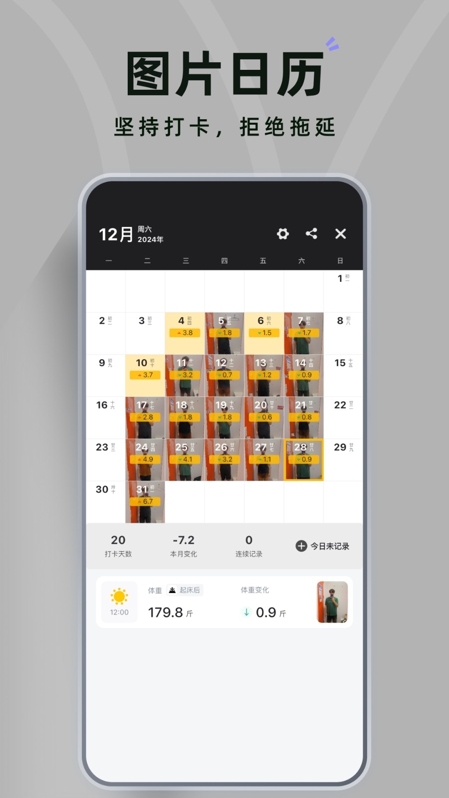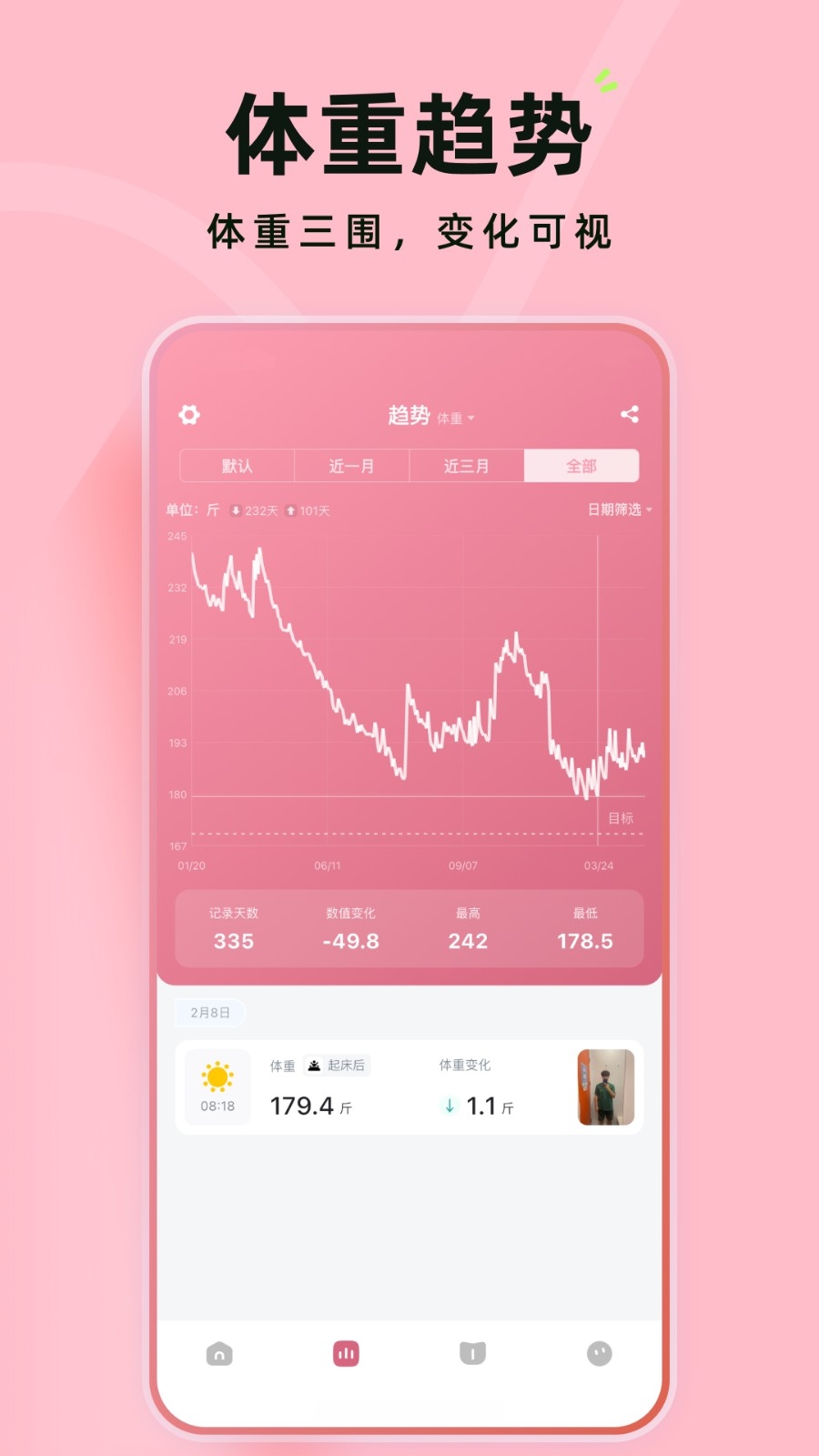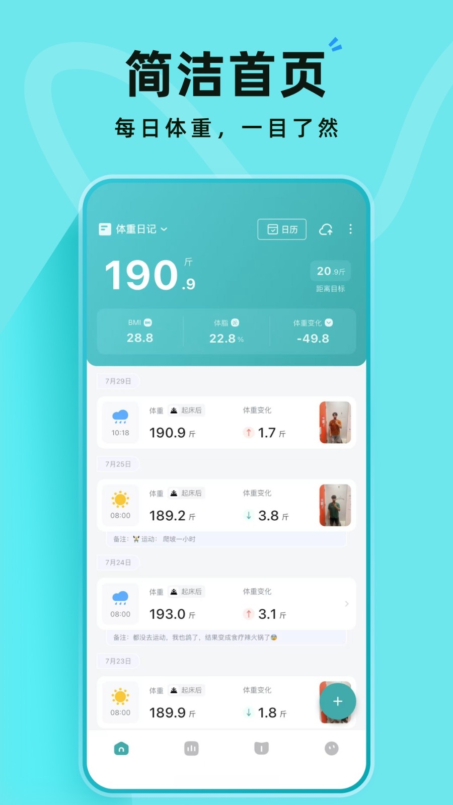 体重日记是一款界面简单、功能强大的个人体重记录软件。用户可以每日记录自己的体重数据,软件根据每日的体重趋势变化形成一个体重趋势图,从而了解自身的体重变化和身体的一个状态。