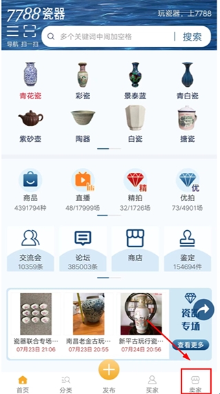 1、打开7788瓷器app,点击下方【卖家】