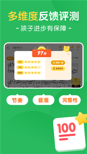 1、大猫通过音准、节奏、完整性等多维度的评测,针对性指出并解决问题,让练琴事半功倍。