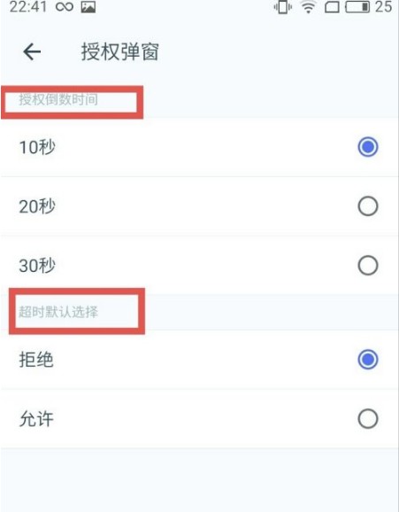 在授权弹窗中能够对“授权倒数时间”与“授权默认选择”进行设置。推荐将授权倒数时间设定为“20秒”,把授权默认选择设为“拒绝”。在允许应用获得授权之前,建议对手机应用的安全性予以检测。