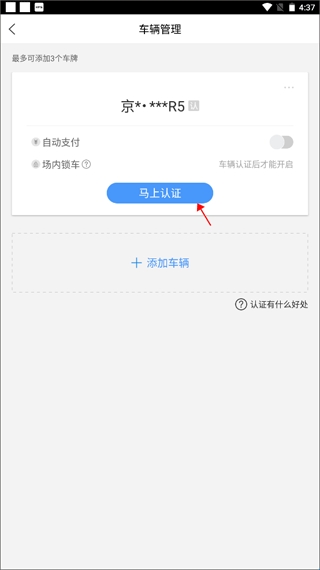 4、将车辆成功绑定之后就要进行认证,点击“马上认证”。