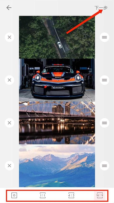 3、进入拼图尺寸预览界面,包括“1:1”、“4:3”和“16:9”尺寸,选择需要的尺寸后,选择“右上角“下一步”选项,