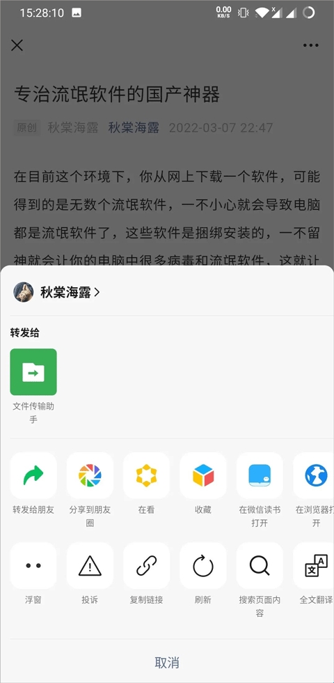比如我们想收藏公众号的文章,我们打开一篇公众号的文章,然后选择右上角的“...”,在跳出来的界面选择复制链接。