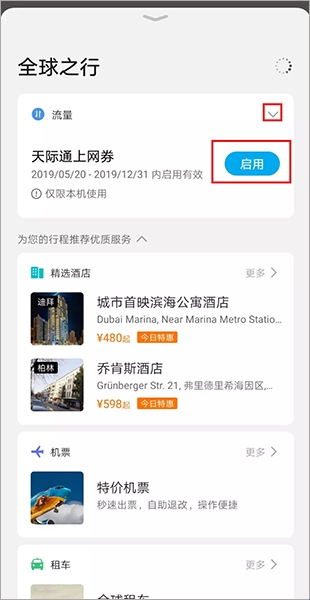 4、在行程卡片中,点击启用按钮连接上网即可;