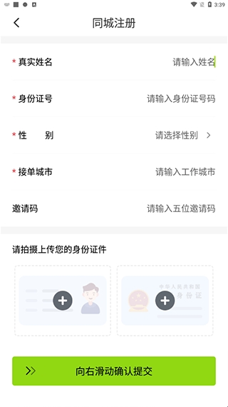 2、按要求填写姓名、证件号码、性别、接单城市,再拍摄上传身份证进行提交,审核通过即可进行接单。
