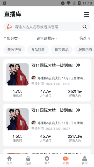 给用户提供到达人直播的销售额、人气以及观看人数等多重数据