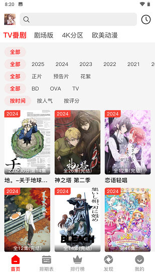番薯动漫app安卓版是一款免费好用的动漫追番软件,进入软件时用户将看到一个简洁明了且易于操作的界面设计,再配上清晰明了的分类筛选区域,能够帮助用户轻松找到自己想看的动漫番剧。软件上的动漫番剧均支持高清画质,且播放无卡顿,让用户可以感受到前所未有的视听盛宴。值得一提的是,在观看动漫番剧的期间没有广告的干扰哦!番薯动漫app安卓版为了让用户快速知道新番的更新时间,特意内置排期表,通过排期表用户可以迅速知道每部新番会在什么时间更新,让自己能够第一时间观看到。不仅如此,软件还内置排行榜,让用户一眼就能知道当下热播的动漫番剧究竟有哪些。