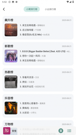 清风DJ安卓版是一款非常不错的听歌神器,该软件有着多种风格的音乐资源,让用户随时打开,都可以轻松进行听哦。此外,资源更新速度快,每天都会上新新的音乐资源,让用户可以听个够哦!并且,支持在线观看和离线下载,没有流量的朋友也可以轻松听。同时,清风DJapp最新版还有分享功能,好听的话音乐可以一键转发给你的好朋友一起听。不仅如此,这款软件还有多种倍数播放哦,这样可以自由进行选择,满足不同人群的需求。有了这款软件,精彩嗨不停!除此之外,还实现了歌曲的歌词与音乐同步显示效果,这样一来就能够帮助用户更好的理解歌曲内容。觉得这款软件不错的话,一定要前来试一试哦!更多精彩有趣的等你前来发现!