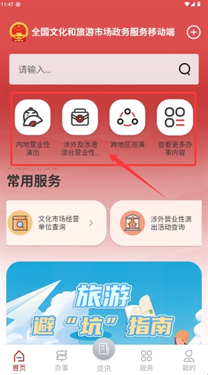 1、启动全国文旅政务移动端,首页可选择跨地区巡演等业务入口。