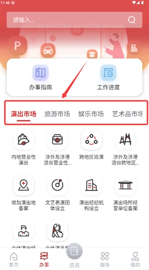 2、进入办事页面后,按演出或旅游类别筛选查找细分服务项目。