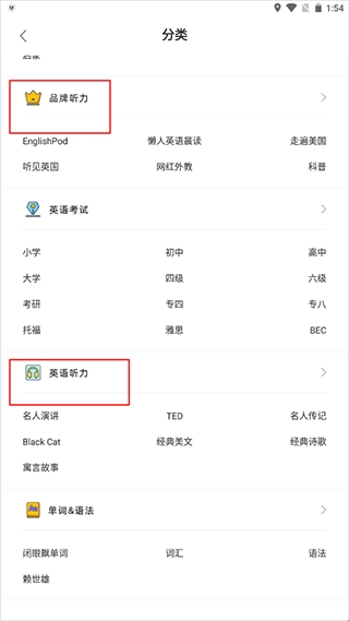 2、也可以点击【更多】,在打开的分类页面中的【品牌听力】或【英语听力】中选择对应的英语听力课程