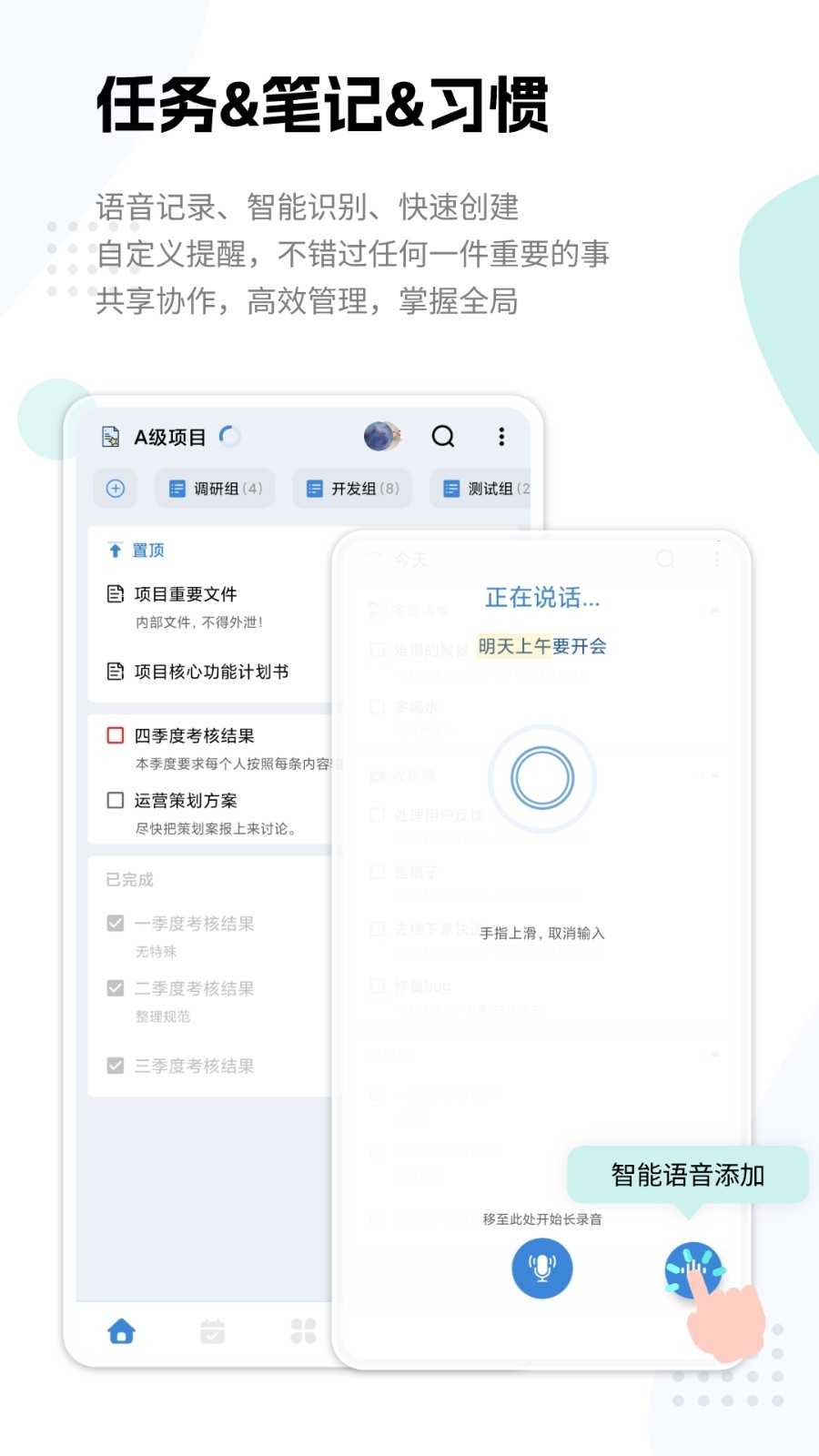 1、你可以通过文字输入、语音识别、音频录制等多种快捷方式来快速记录生活中的点滴、灵感,并管理和安排你的待办事项。