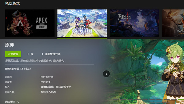 1、GeForce NOW平台自己也有一些合作的游戏,比如原神直接就可以开玩,进去当然还是登米哈游的账号