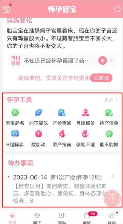 4、在app首页内,往下滑动,还有【怀孕工具】来帮助用户在孕期的健康生活,以及产检提醒等。