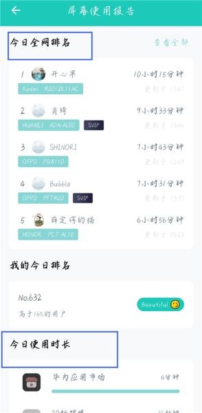 6.查看详细信息:在详细报告页面中,用户可以查看自己的排名情况,以及手机各个应用的具体使用时间。