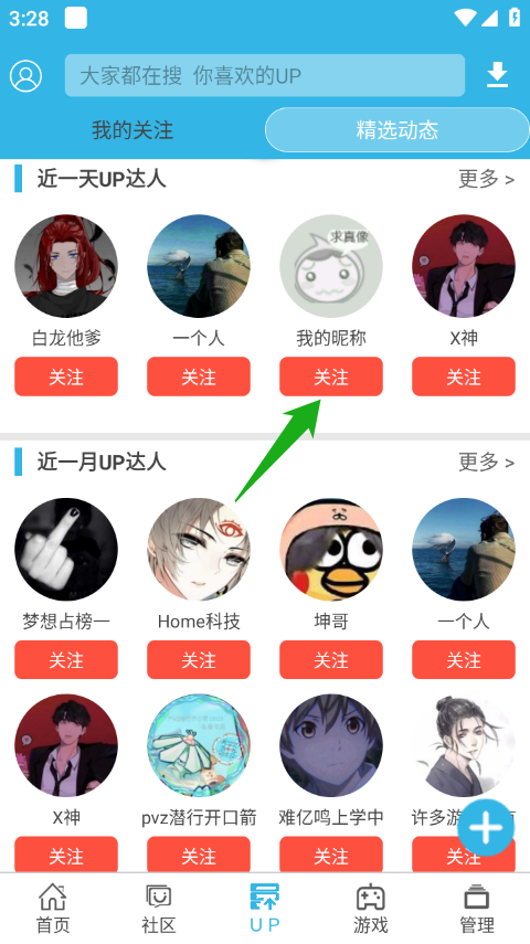 1、进入该应用,第一种方法就是直接在【up】页面搜索up主的名字。