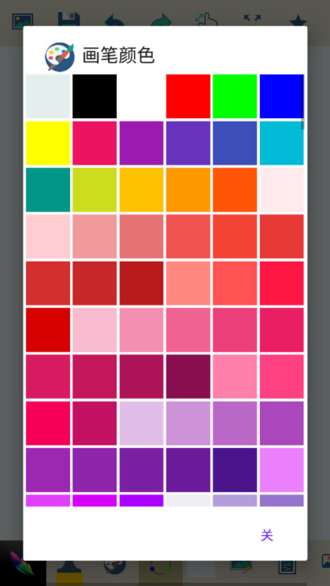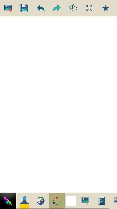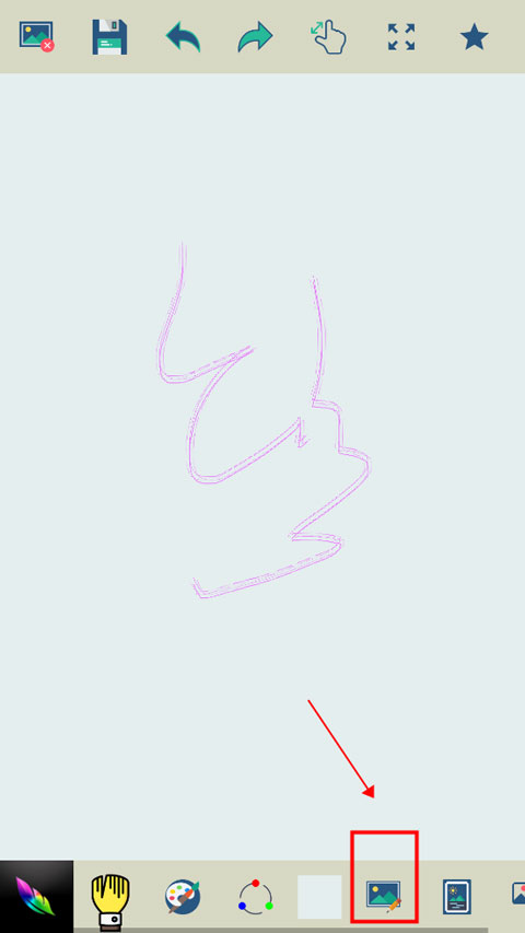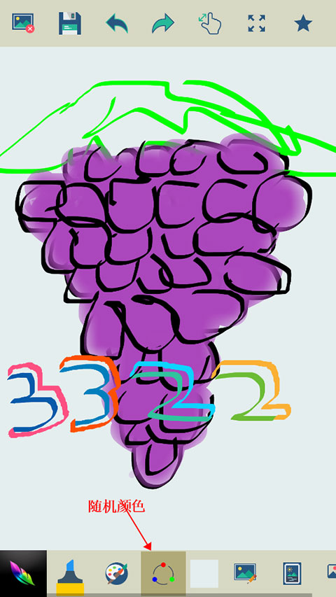 2、如下图所示,顶部图标分别代表清空画板、保存、撤销、局部放大以及收藏功能,下方是画笔、颜色、随机颜色、背景、相册以及分享等功能。