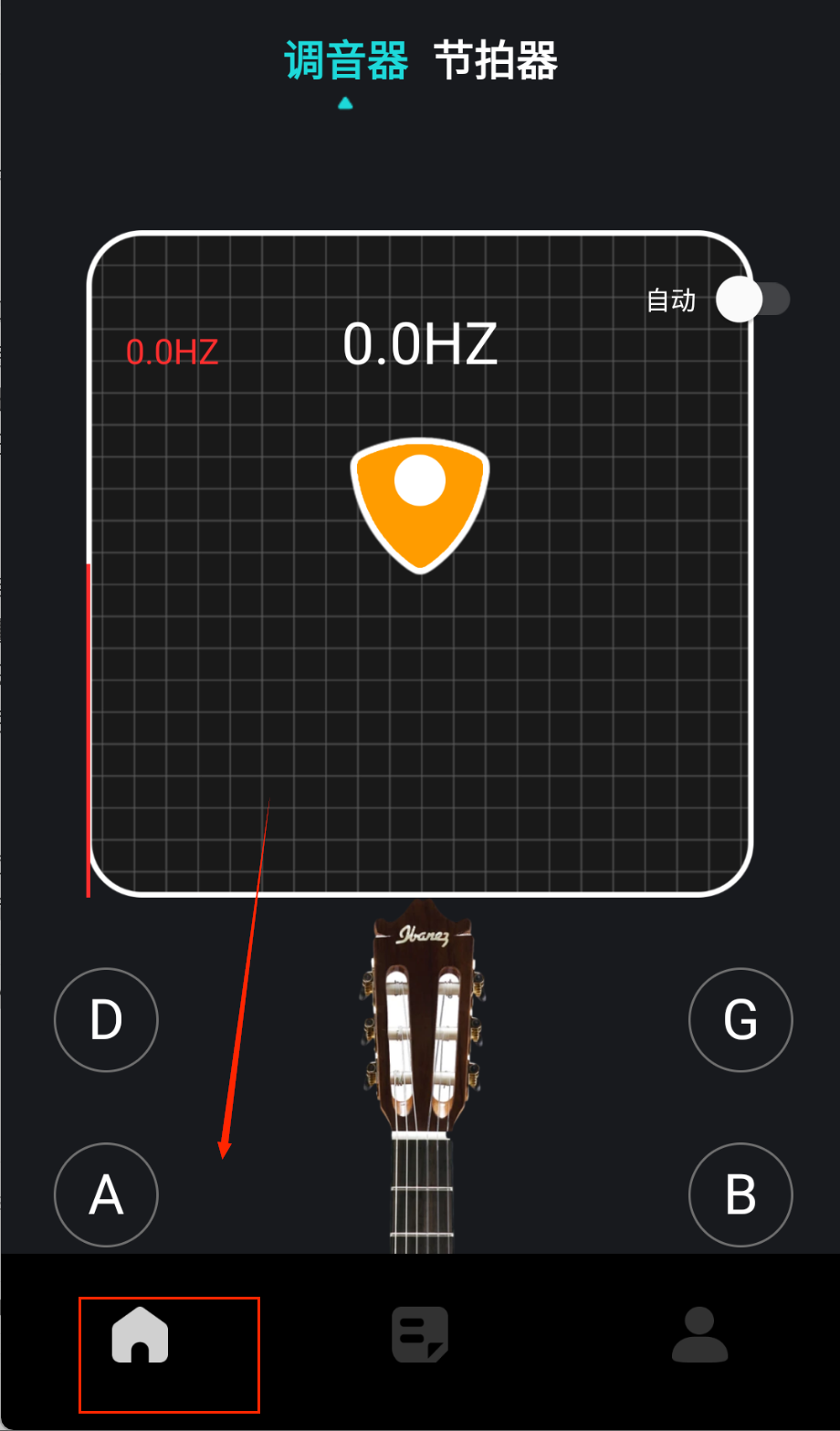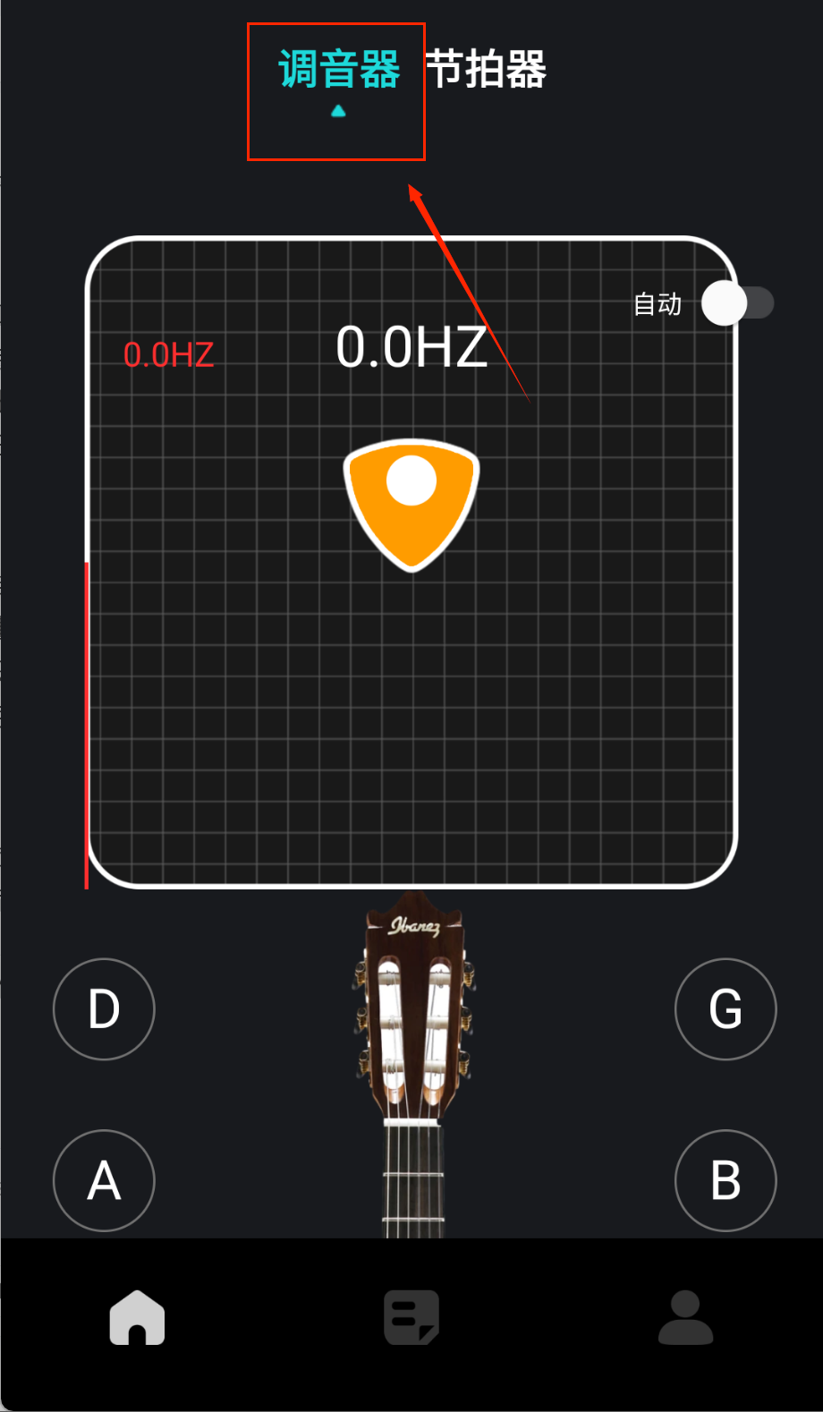 3、使用调音器功能时将手机靠近乐器发声部位,根据屏幕上的指针指示和颜色提示调整琴弦,直到显示调音准确为止。