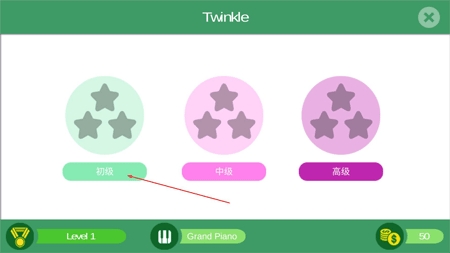 3、打开曲目后,可以选择初级、中级、高级练习;