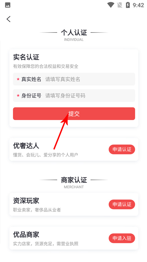 3、进入个人认证页面后,输入真实姓名与身份证号,点击提交,再经过人脸识别,即可完成认证。