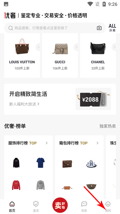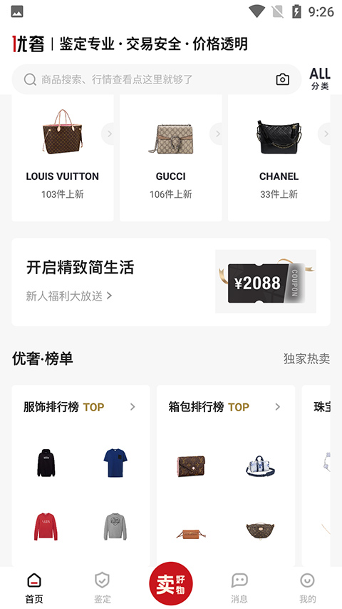 1、首页各种最新好物、优奢榜单、单品包包等首页推荐。