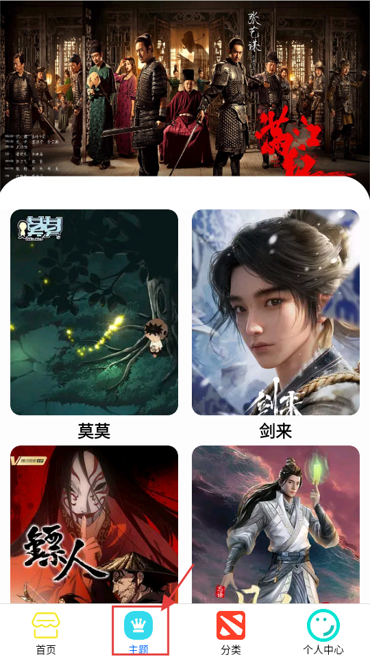 3、点底部【主题】,有【莫莫】【剑来】等主题内容,选喜欢的主题,查看相关作品。