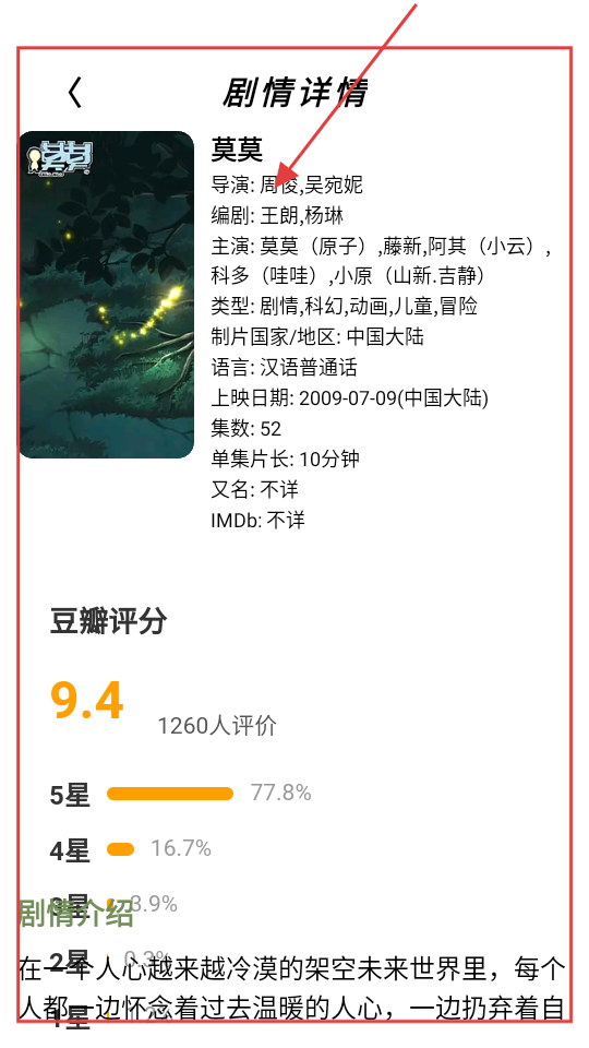 4、进入剧情详情页,如【莫莫】的详情,可查看导演、编剧等信息,还有豆瓣评分,了解作品情况。