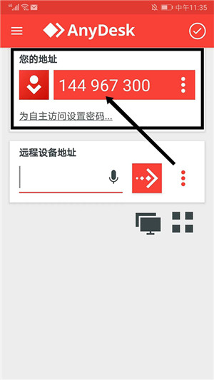 1、打开AnyDesk安卓版,在“远程设备地址”栏输入对方设备ID地址,选择“箭头”图标,
