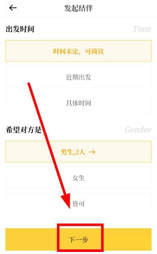 4.设置结伴详情:接下来,你需要设定结伴的时间、希望同行的对象(如性别、年龄范围等)以及人数,设置完成后再次点击“下一步”。