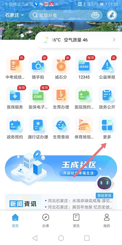 1、用户在手机上打开并登录掌上石家庄石i民app,进入首页中点击【更多】