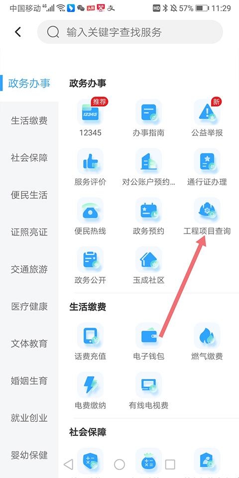 2、在打开的新页面中,找到政务办事子项中的【工程项目查询】点击