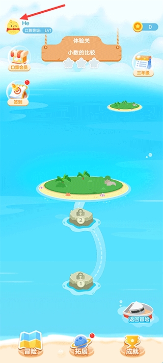 1、打开软件后,在冒险界面,点击左上角的头像。