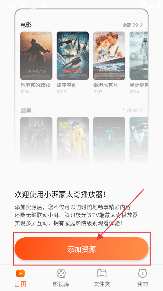 1、进入小湃蒙太奇播放器首页,有电影、剧集推荐,点【添加资源】,可添加本地或网盘等存储资源,畅享更多内容。