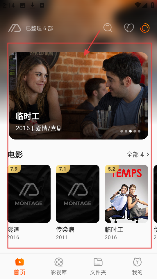 3、资源添加后,在首页能看到整理好的影视,如【临时工】,还有电影分类,选感兴趣的影视,查看详情准备播放。