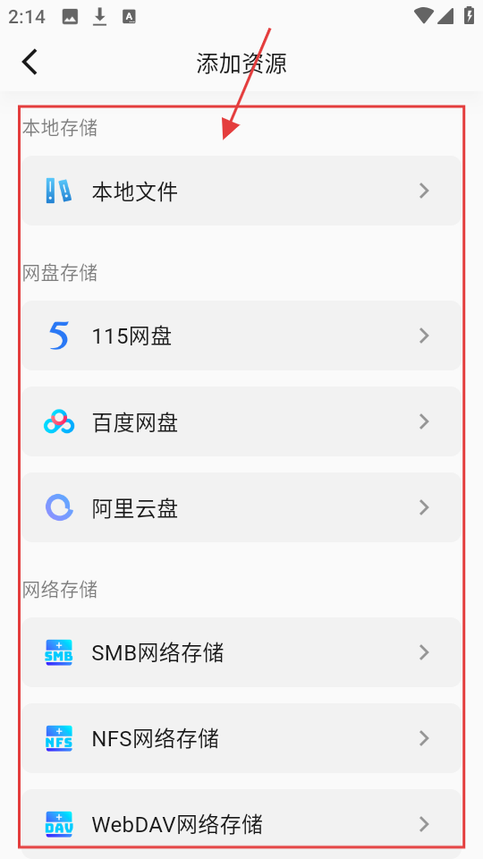 2、进入添加资源页,有本地存储、网盘存储、网络存储等分类,选对应存储方式,如【百度网盘】,添加影视资源。