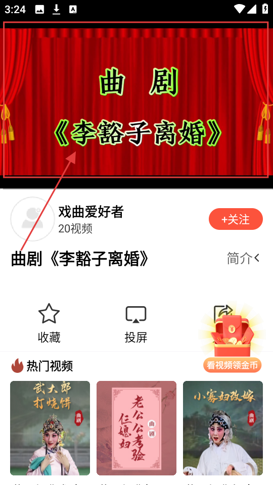 4、进入曲剧《李豁子离婚》播放页,可观看戏曲内容,还能收藏、投屏,方便后续重温或分享给他人。