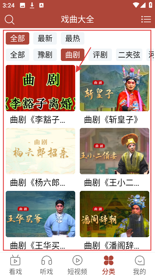 3、进入戏曲大全页,选【曲剧】分类,能看到《李豁子离婚》《斩皇子》等曲剧作品,选感兴趣的进入播放。