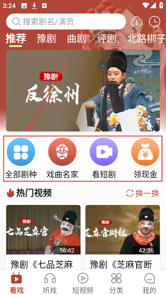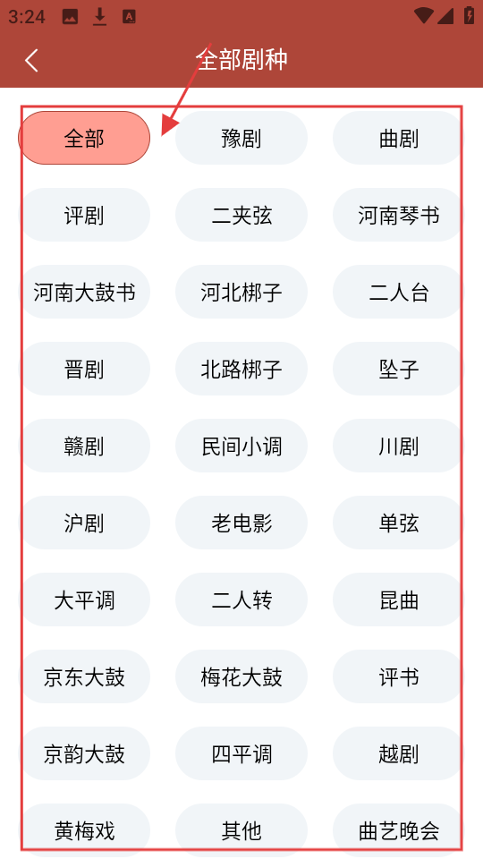 1、进入APP首页,有【全部剧种】【戏曲名家】等功能,想找各类戏曲,点【全部剧种】,查看所有剧种分类。
