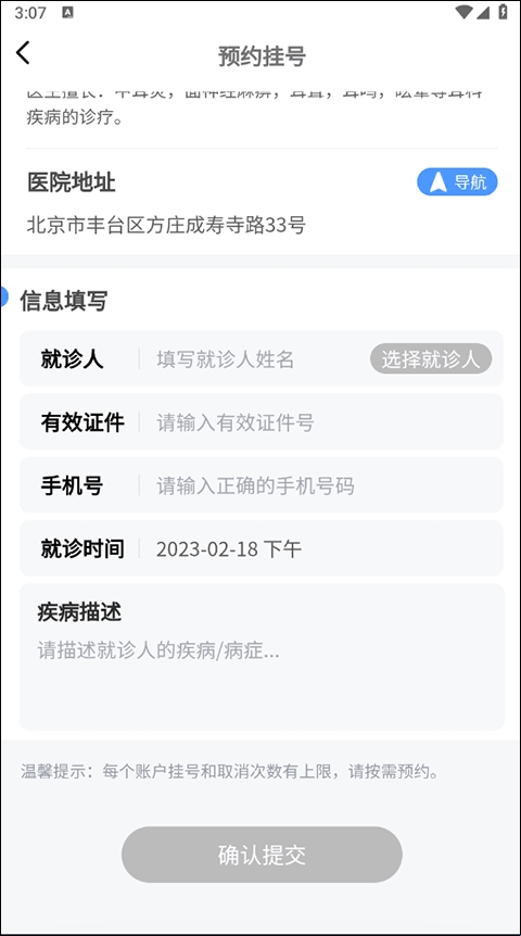 4、在预约挂号界面填写好就诊人姓名、有效证件、手机号、就诊时间、疾病描述后找到并点击“确认提交”选项;
