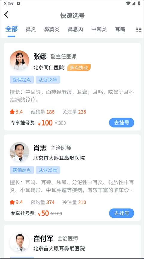 2、在快速选号当中找到并点击“去挂号”选项,进入具体医生详情界面;