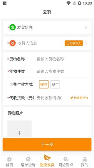 2、然后输入发货单详细信息,点击下一步发布订单就会有专门的货车司机接单,在我的发货查看详情。