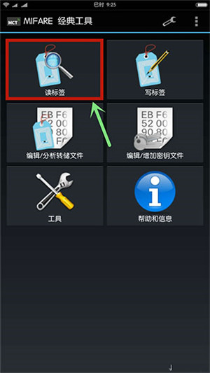 1. 首先开启手机的NFC功能,接着打开MIFARE经典工具。之后,把卡片贴近NFC识别区域,如以下图示,此时屏幕上会显示“发现新标签”的字样,最后点击“读标签”选项。