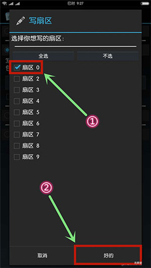 这里选择扇区0就行了,如果要“全盘复制”就选择所有扇区;然后把目标卡放到手机NFC区域,点击“好的”。