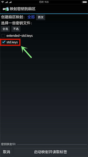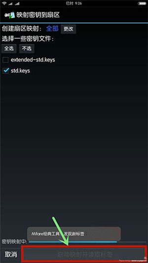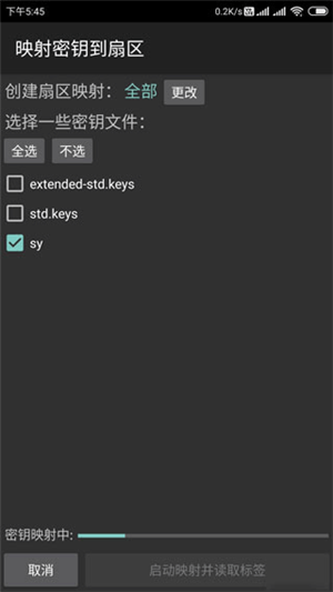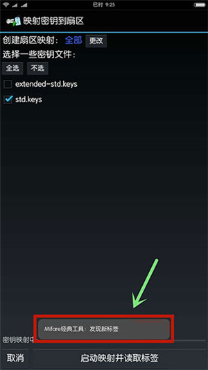 2、于MCT主界面,点击“读标签”,接着勾选密钥文件(其中包含常用密钥),随后将原卡放置在手机NFC感应区,最后点击“启动映射并读取标签”