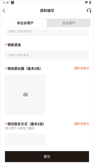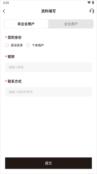1、用户注册并登录应用后,需填写相关资料。该应用面向企业用户与个人用户。个人用户在非企业用户页面,可选择自身身份,输入昵称并留下联系方式。